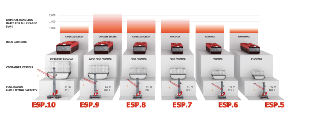 Las Grúas móviles portuarias de Konecranes Gottwald cargan y descargan contenedores de todos los tamaños y tipos, para dar servicio a buques que pueden ir de la clase Feeder hasta la clase super post-Panamax, con tamaños que van de 20′ a 45′, así como contenedores estándar, descubiertos, refrigerados, etc. Pueden utilizar una gran variedad de tipos de bastidores de carga.